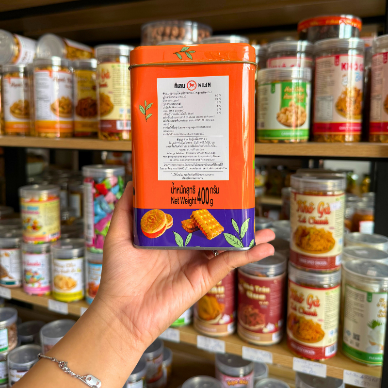 Bánh Quy Nhân Trà Thái Hộp Thiếc KILIN Thái Lan 400g – Hộp Màu Cam Tím