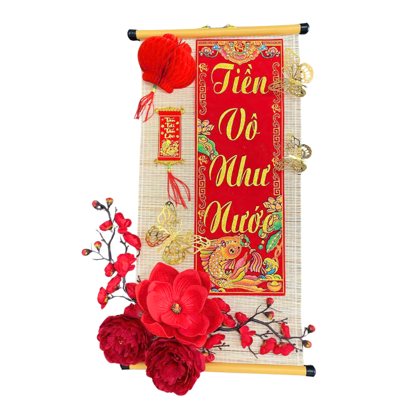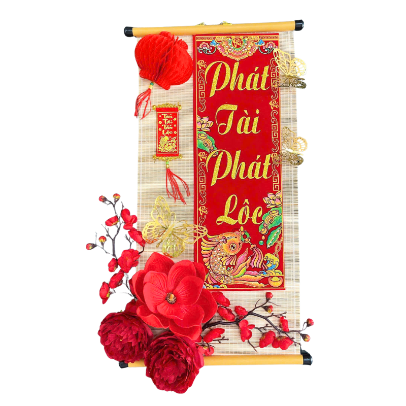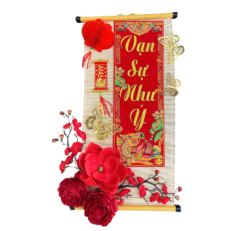 Muốn góc nhà, góc shop “đổi vibe Tết” chỉ trong 1 giây? Tranh treo Tết phối sẵn hoa đỏ – quạt giấy – dây treo may mắn chính là lựa chọn sang nhất mùa này. Tấm nền trúc nhẹ nhàng kết hợp bảng chữ thư pháp đỏ ánh kim nhìn vô là thấy Tết liền.