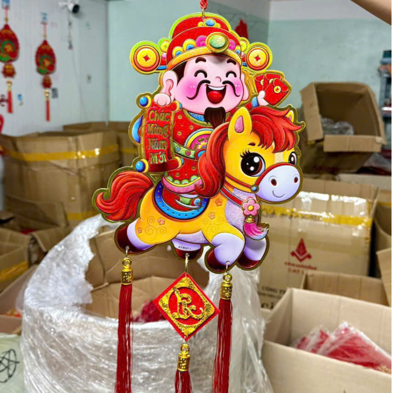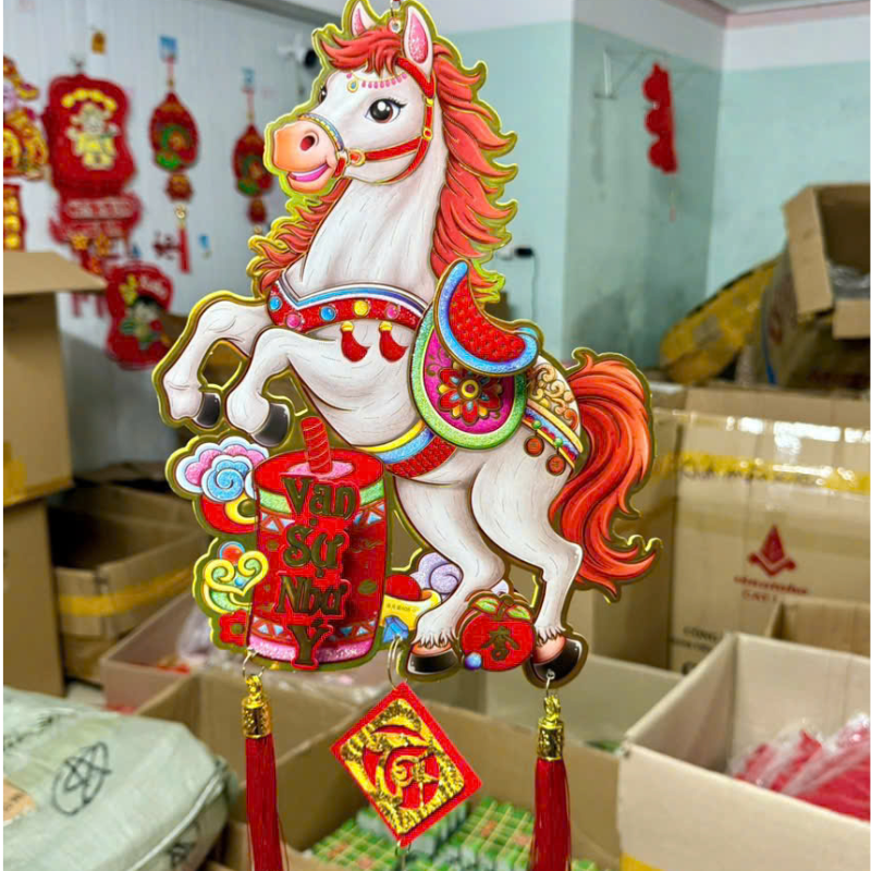 Dây treo hình ngựa nhung ánh kim với tông đỏ – vàng chủ đạo, chi tiết in nổi sắc nét, ánh kim lấp lánh khi lên đèn, rất phù hợp cho không gian Tết sang trọng và hiện đại. 🐴
