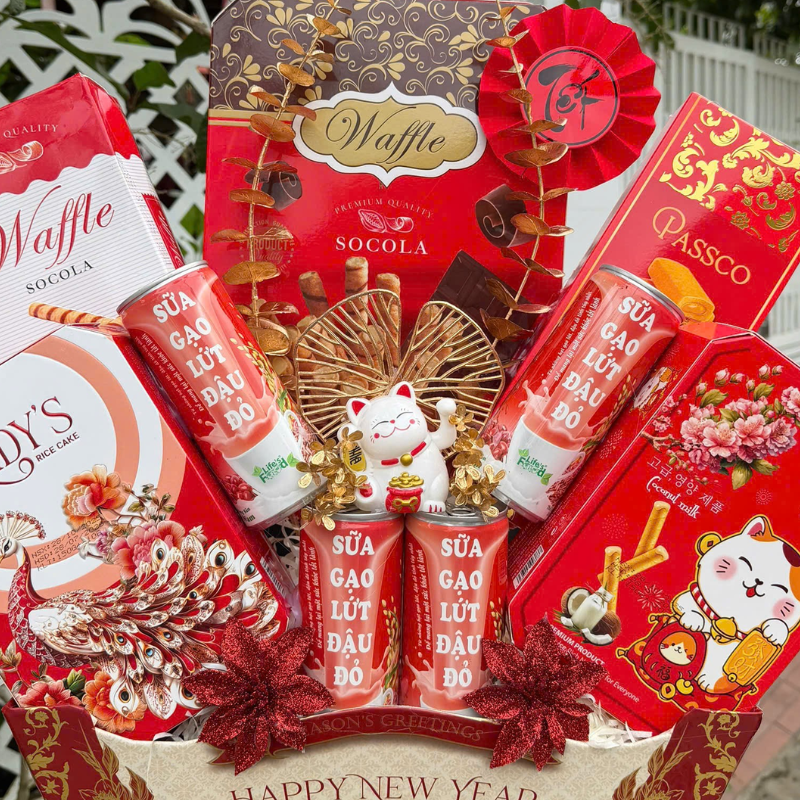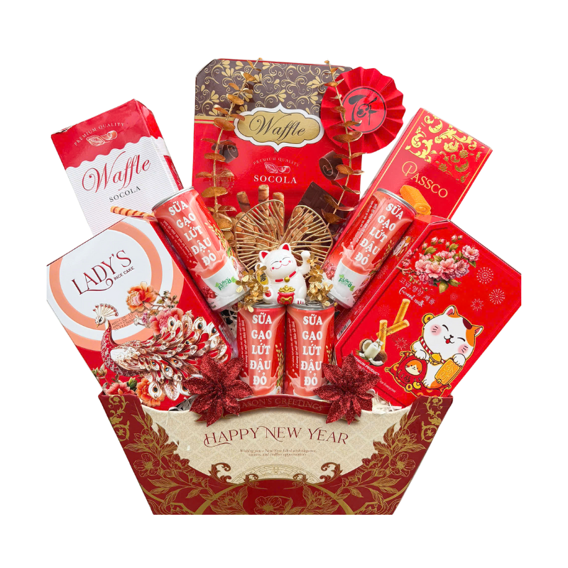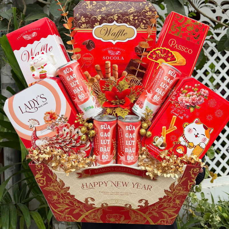 Mẫu giỏ này lên form đỏ rực rỡ, điểm hoa mai, mèo thần tài và các món bánh kẹo đồng màu khiến tổng thể nhìn cực kỳ bắt mắt, sang mà vẫn thân thuộc.