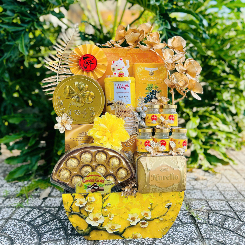 Mang theo lời chúc cát lành – thịnh vượng – lộc đủ đầy, giỏ quà vàng cao cấp là lựa chọn hoàn hảo để biếu Tết năm nay. Màu vàng chủ đạo tượng trưng cho tài lộc – phú quý – sung túc, tặng ai cũng đẹp lòng, nhận ai cũng vui.