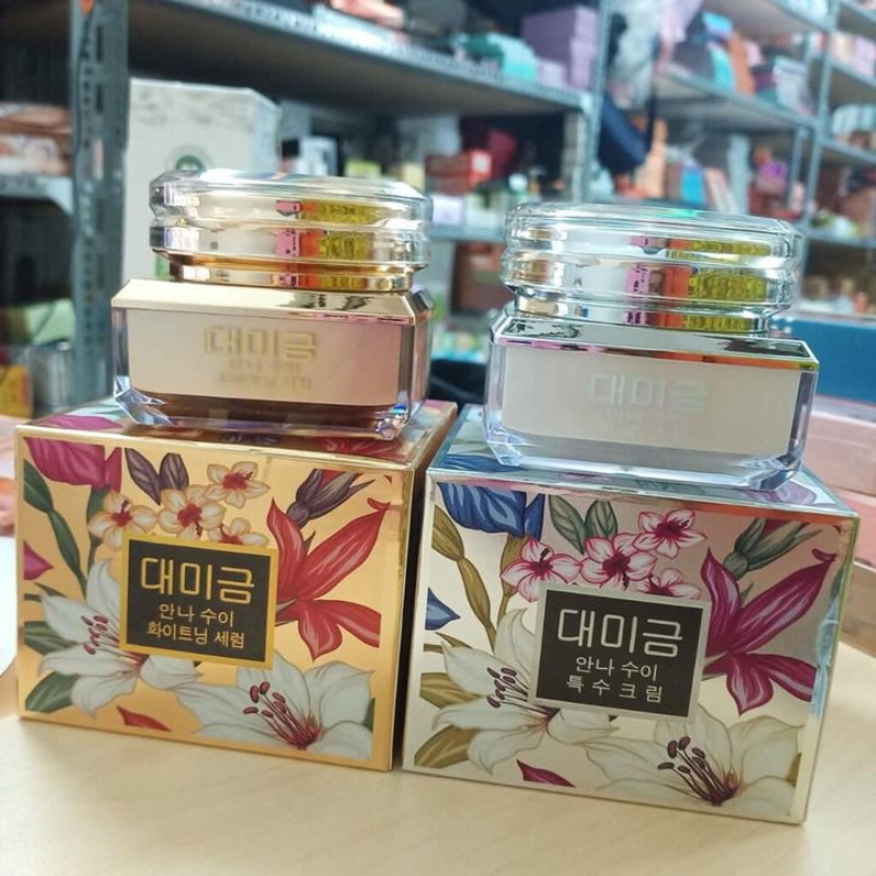 - Hũ thủy tinh vàng sang chảnh, đựng trong hộp hoa văn sắc sảo – đậm chất “tiểu thư skincare” 🌸