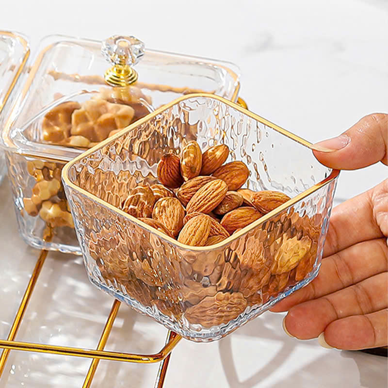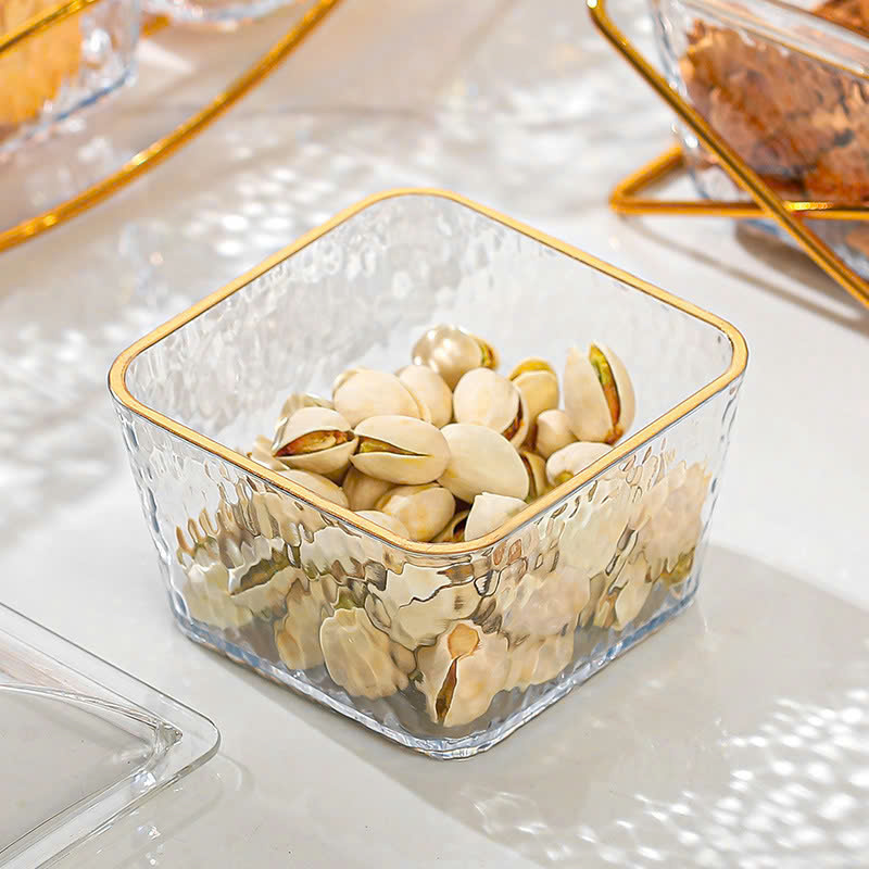 ✔️ Hũ mứt làm từ chất liệu nhựa dày và trong suốt, viền hũ được mạ vàng (không bay màu) tăng sự sang trọng cho không gian căn phòng
