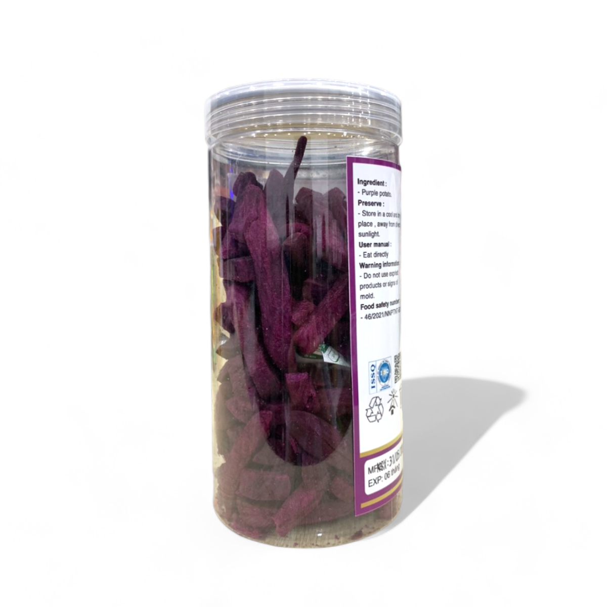 Khoai lang tím sau khi thu hoạch sẽ được rửa sạch gọt vỏ, xử lý vệ sinh và đưa vào máy xắt thành từng miếng dạng thanh nhỏ vừa miệng. Sau đó đưa vào buồng Sấy thăng hoa trong môi trường chân không với tác nhân dầu, cho ra sản phẩm.