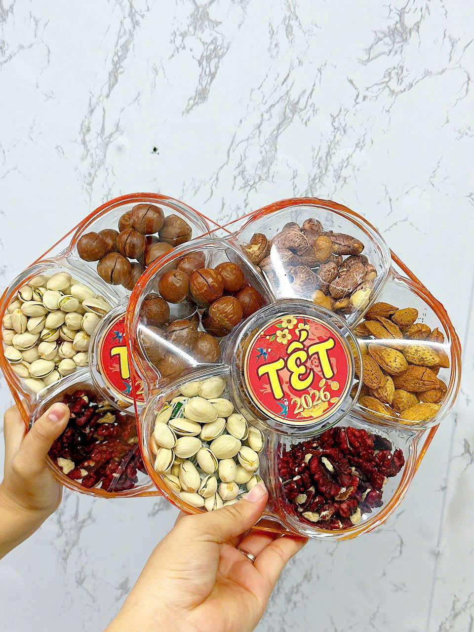 Set Hộp Mix Hạt Ngũ Vị (Hạt Điều Rang Muối, Quả Óc Chó Vàng, Quả Óc Chó Đỏ, Macca, Hạt Dẻ Cười, Hạnh Nhân Rang Bơ) Bông Mai 600G Hộp Tết 2026