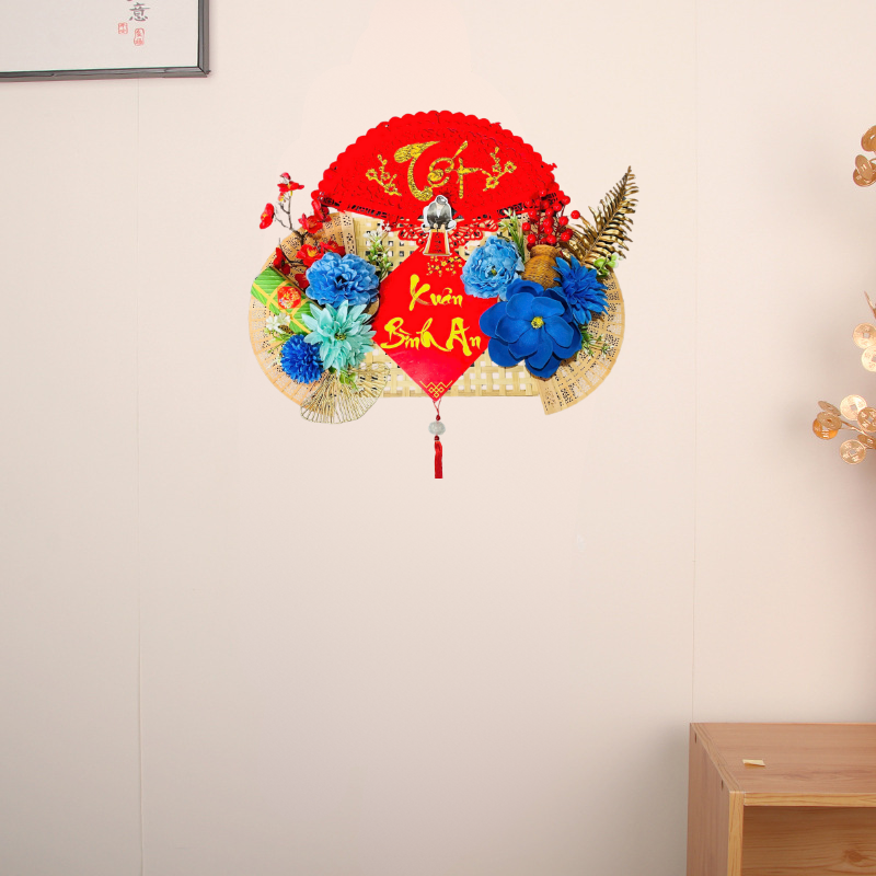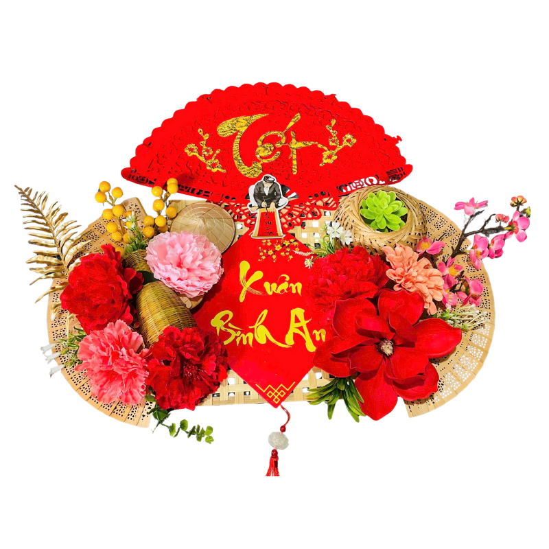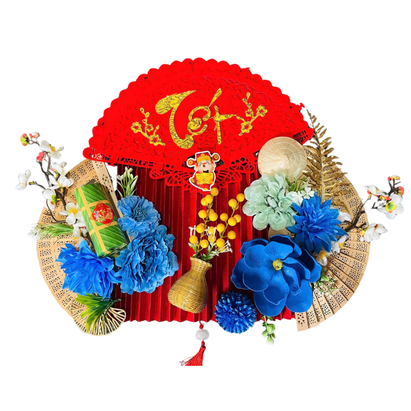 Mang trọn không khí xuân vào nhà chỉ với một bộ phụ kiện đầy đủ và hài hòa sắc đỏ – vàng may mắn. Set được phối sẵn quạt giấy đỏ, mành tre, hoa lụa, đào – mai, bánh chưng mini, bình rơm, dây tiền vàng và charm trang trí… tạo nên bố cục chuẩn Tết Việt, sang mà vẫn ấm cúng.